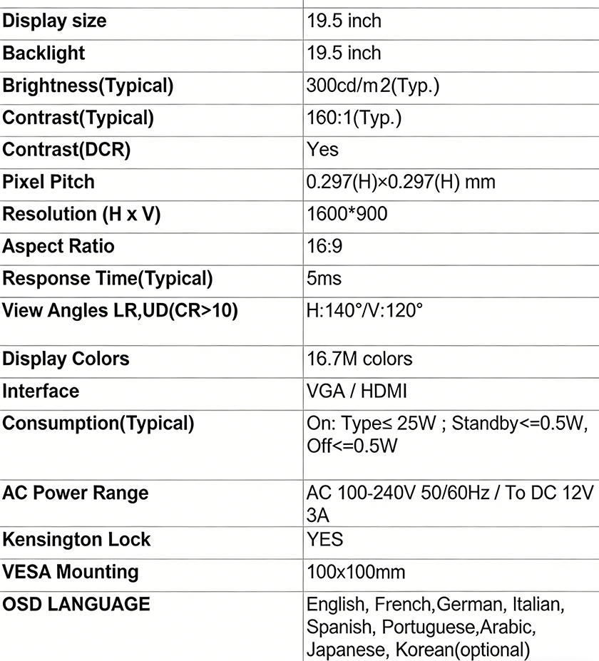 • 19.5 inch monitor 16:9